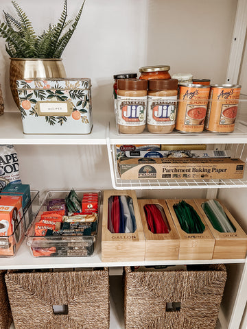Since I have limited drawer space in my kitchen, I keep my zip locks in the pantry - an area that has been screaming for some organization for a while now. I knew that if I was going to be taking photos of these storage bag containers and sharing them with the world, then the time had come to get this space looking neat and tidy!